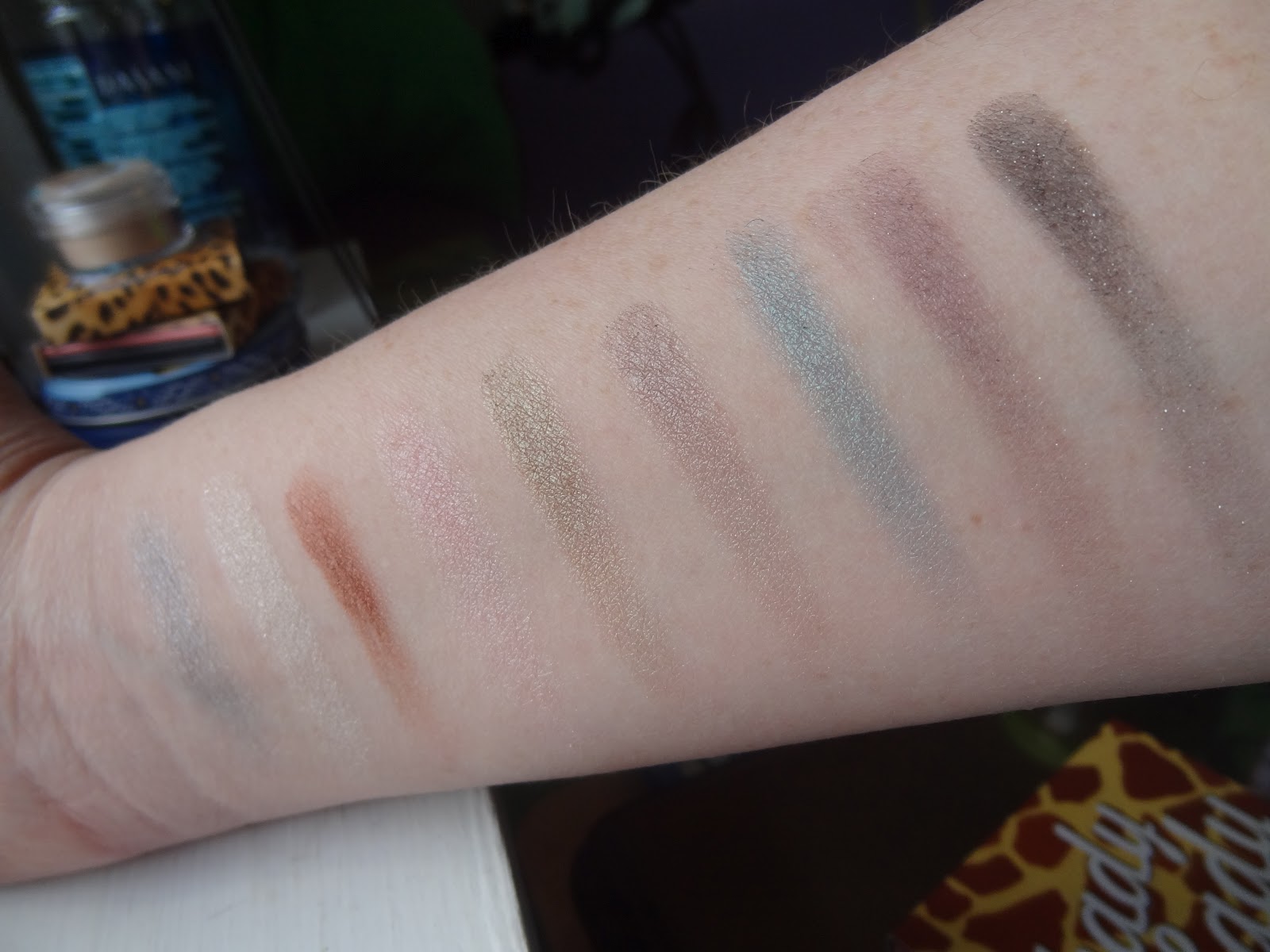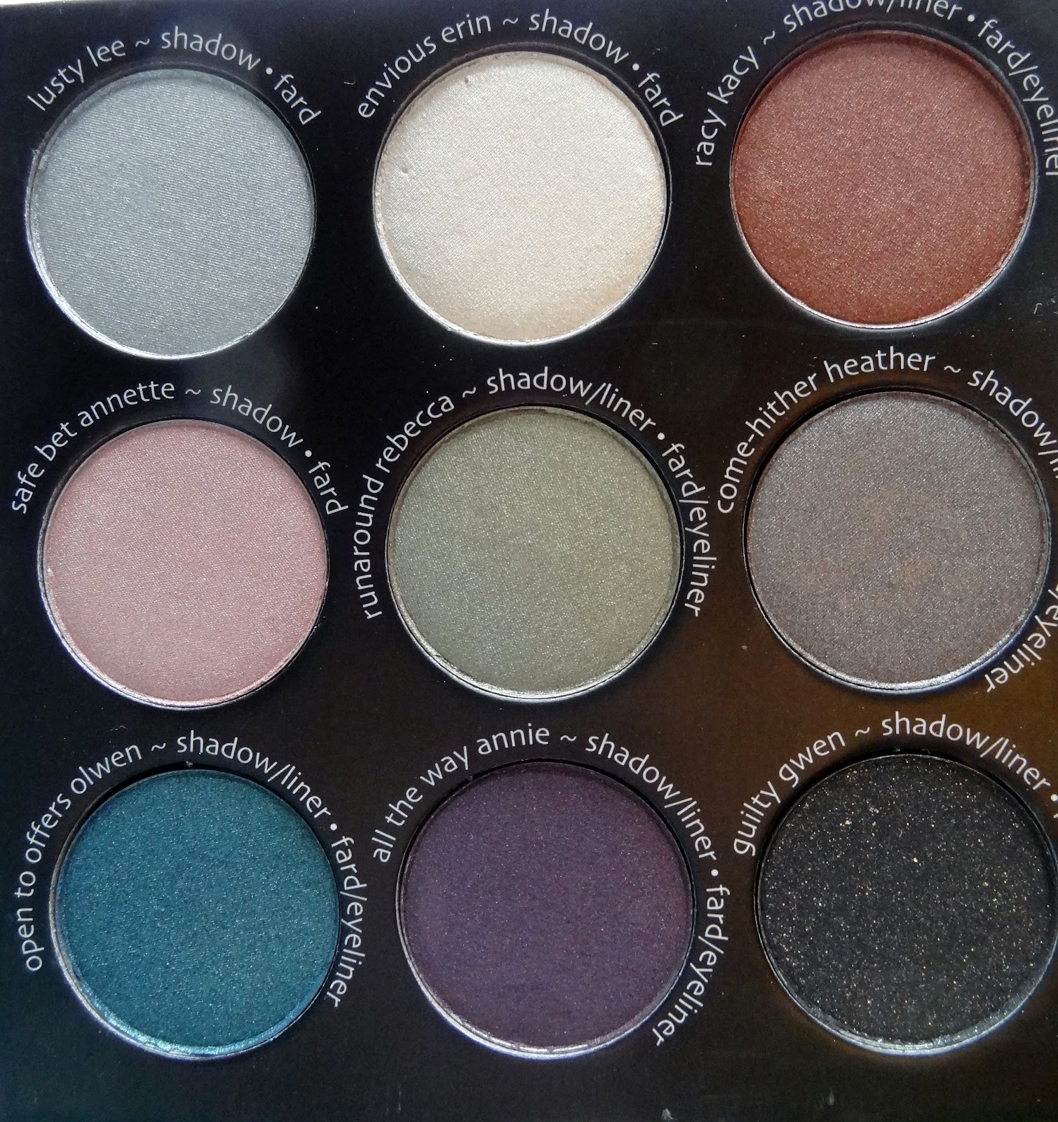 The Palette has gorgeoussssssssssssssss colors. The only one that has glitter in it, it seems is guilty gwen. When I was in Marshalls I thought they were chalky because I found three of them that were basically destroyed and looked chalky but when I found the one that I got that wasn’t touched I was pleasantly suprised at how smooth these are and I love the packaging. It’s like cardboard, ecofriendly look however it isn’t cheap feeling. I adore it. I also like that they make a point to mention which colors could be used as liners. Which could help people who are just starting out. Additionally these can all be worn wet for a more intense look though they are already pigmented, and very user friendly. <3 If you haven’t gotten your hands on these you definitively need to try it!