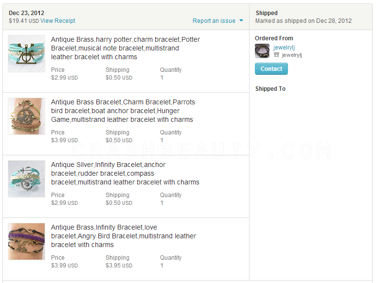 I haven’t had many purchases as of recent. However, I did order 4 bracelets from a China etsy shop. I figured it would be easiest to simply screen capture my order with the shop details and all.