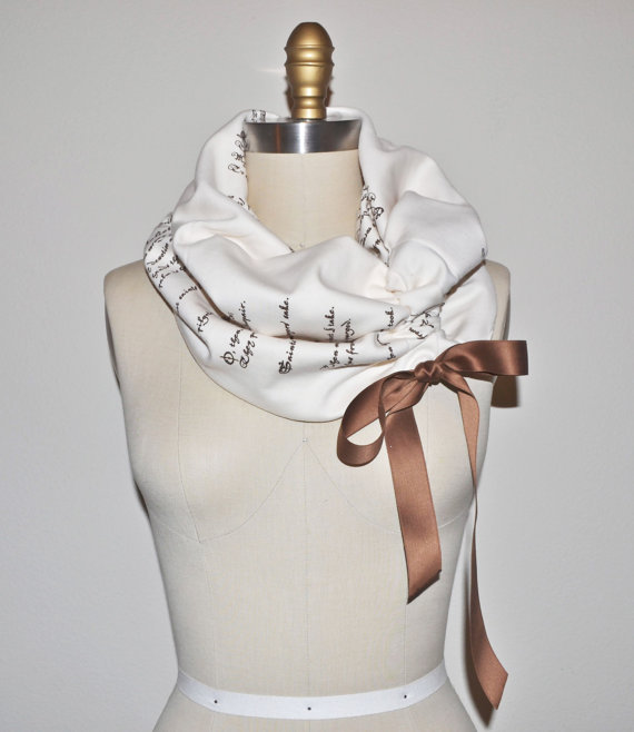 Let’s be honest, in the last year or so I’ve become a little obsessive with scarves. To me scarves are a perfect accessory since many days I just wear jeans and a t-shirt. Now what’s the hardest possession for me to give up? My books, I have two book cases in my teeny, tiny room and I refuse to get rid of my books even though it would save me so much space. So what do I come across while searching on one of my favorite websites Etsy.com? A store that MAKES customized scarves of book quotes……. Oh yes I am in love.