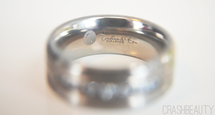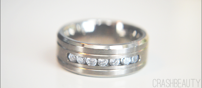 This ring is made of titanium and contains clear cubic zirconia stones. It comes with a satin bag for storage. It is a nice weight on your finger. Doesn’t feel cheap or easy to break but doesn’t feel heavy either. It is very smooth and comfortable. After wearing it a number of times in the last month or so it obtained several scrapes across the matte mid-section of the ring but all are superficial and not deep.
