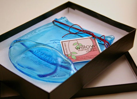 Over at Willow Stained Glass shop you’ll find some gorgeous blue mason jars flattened down. You can use it for a variety of thins like a spoon rest, change holder, votive holder, soap dish, butter server and the list goes on. At $12 this recycled gift could be talk of the table.